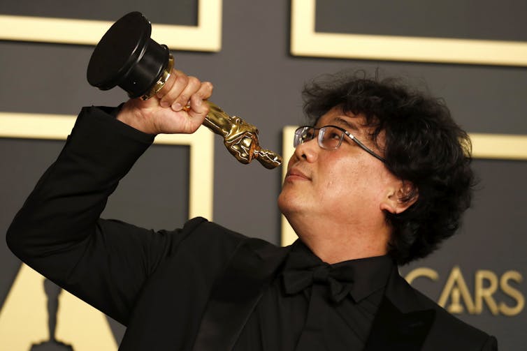 Bong Joon-ho berpose dengan piala Oscars yang dimenangkannya lewat film Parasite. Parasite adalah film non-bahasa Inggris pertama yang memenangkan kategori film terbaik di Oscars.